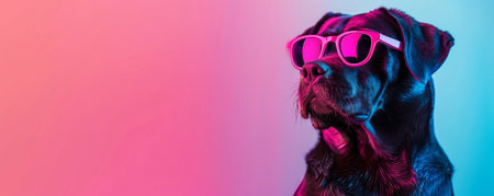 Black dog wearing pink sunglasses against a neon pink and blue background.