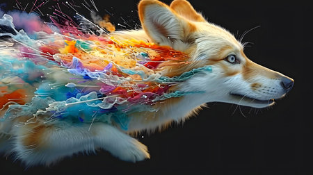 Abstract digital art of a dog with vibrant, colorful streaks and splashes on a dark background, representing motion and energy.