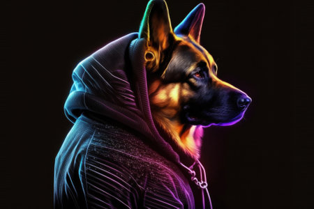 On a black background with a neon gradient light, a German Shepherd wears a hooded sweatshirt and headphones to listen to music. Dog looks like human. Creative portrait. Animal life pets love concept. Generative AI