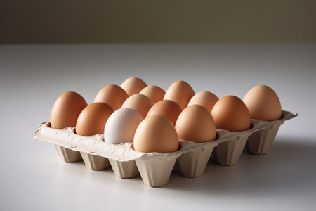 A simple egg carton containing a few white eggs, slightly tilted to create a dynamic composition Generative AI