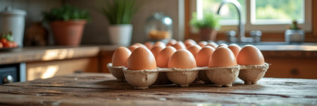 Fresh brown eggs in carton on rustic kitchen table with natural light. That the image is generated using AI.