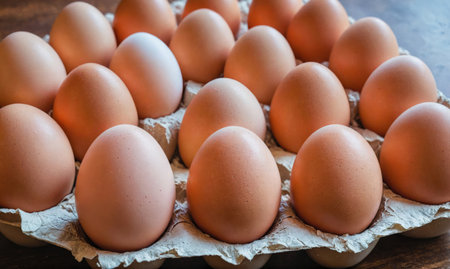 A beautifully arranged carton of fresh farm eggs sits on a rustic wooden surface, highlighting the natural textures and earthy tones. Ideal for culinary themes.