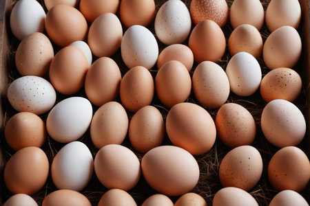 Many fresh organic chicken eggs of different colors are creating a beautiful and varied background, showcasing the diversity of natures produce in a chicken coop or egg farm setting