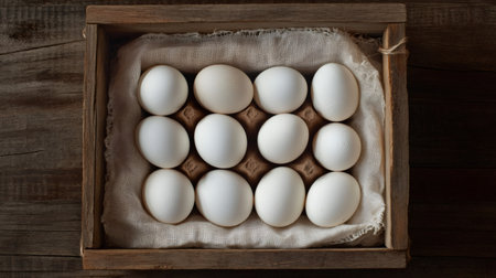 Fresh organic white chicken eggs nestled in a cardboard carton on burlap inside a rustic wooden crate, creating a farm fresh, natural food vibe