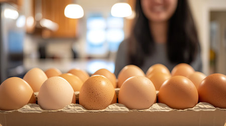A row of farm-fresh eggs in a cardboard box, with a blurred kitchen scene in the background.