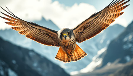 gull falcon soaring through the air against a picturesque mountain backdrop. this stunning photograph captures the essence of nature's beauty, reminiscent of the artistic styles of sacha goldberger, beatrix potter, and magali villeneuve. shot with the precision of a rollei prego 90, the macro perspective highlights intricate details. the dark yellow and brown tones add a touch of warmth and depth to the image. ai