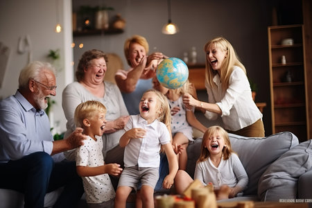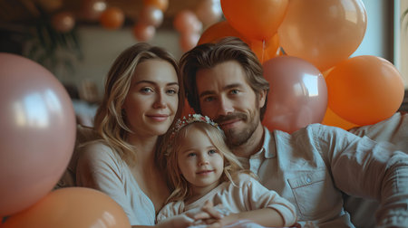 Portrait of a cheerful family during a celebration, framed by colorful balloons and a joyous mood. A.I.