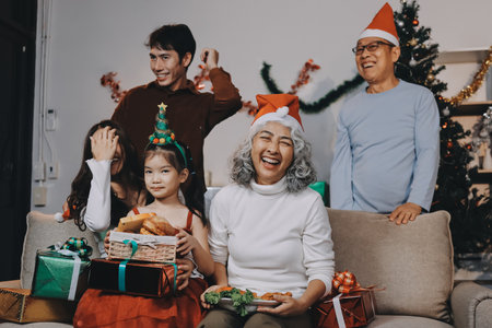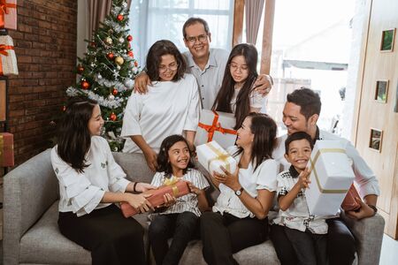 Portrait of Asian family exchanging presents during christmas at home. Attractive happy people holding gift box, celebrate holiday thanksgiving, xmas eve tradition in living room in house together.