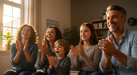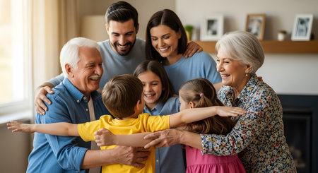 A happy multigenerational family, including grandparents, parents, and grandchildren, shares a warm group hug in their living room. Everyone is smiling broadly, demonstrating strong family ties and love across generations. The indoor setting is cozy and inviting, representing a supportive home environment.