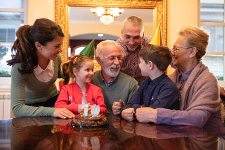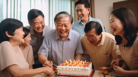Happy three generation Asian family celebrating grandpa's birthday at home