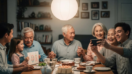 A multigenerational family is gathered around a table, sharing a meal and smiles. The scene depicts a warm environment, soft lighting, and a happy atmosphere. A person takes a picture with a smartphone. The image suggests potential use in articles or advertisements related to family or togetherness.