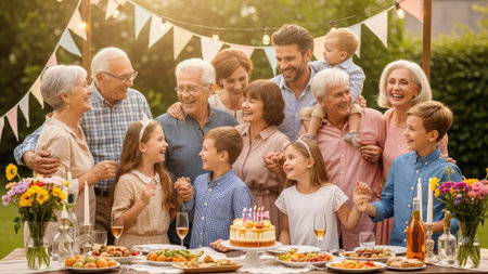A multigenerational family gathers around a table decorated with flowers and a cake. The scene is illuminated by warm sunlight, suggesting an outdoor celebration. Various members are embracing each other, exuding joy. This image could be suitable for illustrating events, family connections, or social gatherings in commercial projects.