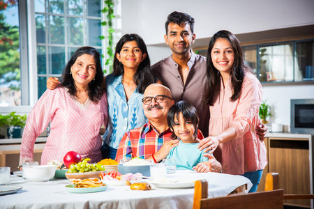 Portrait of Indian family of three generations eating meals together at home looking at camera