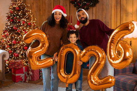 Joyful Latin family with boy wearing Santa hats, holding large balloons, standing in warmly decorated living room, ready for New Year
