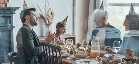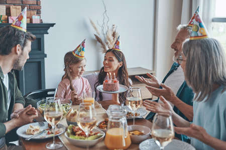 Happy family celebrating birthday of little girl while sitting at the dining table at home