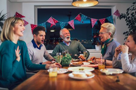 Beautiful happy family gathered around the table, having Christmas dinner all together at home, celebrating Christmas and making a toast