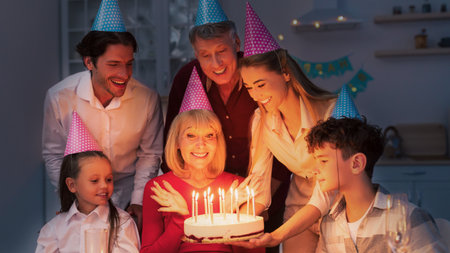 Multi generation family having birthday party in evening, presenting senior woman cake, enjoying holiday at home