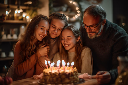 A family celebrating a birthday with a cake and balloons. Generative AI image.