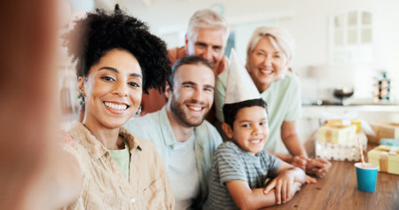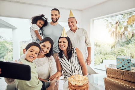 Birthday, selfie and love with family at home for party, celebration and picture. Support, dessert and smile with portrait of parents and kid for memory, photography and surprise event together