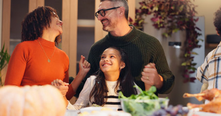 Happy family, talking and fun for thanksgiving with children, event and food for holiday or vacation. Feast, people and interracial parents at dinner party, reunion and gathering for bonding in home