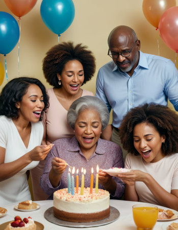 a family with diverse backgrounds celebrating a child's birthday, with balloons, cake, and joyous smiles
