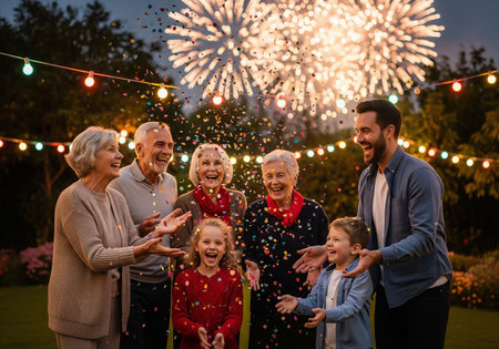 A multigenerational family gathers outdoors, beaming with happiness as vibrant fireworks illuminate the night sky. Confetti and string lights add to the festive atmosphere of this special moment.