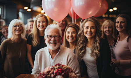A cheerful family of five, including a grandfather, parents, and two children, smiles brightly against a backdrop of pastel balloons. Their warm expressions radiate love and togetherness, capturing a moment of happiness and connection that transcends generations.