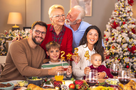 Happy multi-generation family enjoying spending winter holiday season together, having fun holding balloons shaped as numbers 2024 while having Christmas dinner at home