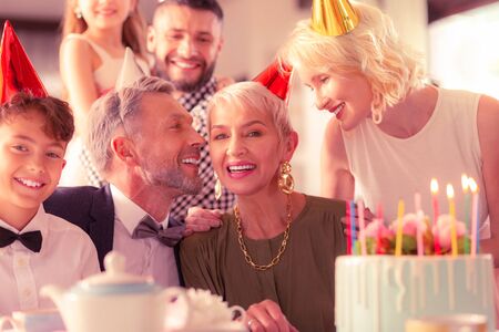 Family celebrating birthday. Big happy family feeling memorable while celebrating birthday of granny together