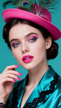 Stylish woman with bold pink and blue makeup, wearing a pink hat adorned with peacock feathers. Dressed in a teal satin outfit with black lace details, posing confidently.