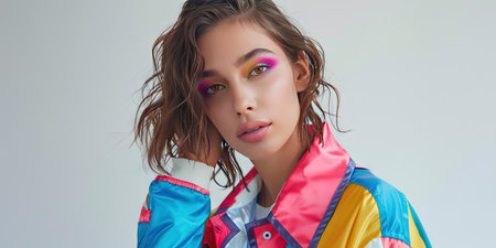 Woman looking confidently at camera with striking makeup and colorful jacket. Set against a dark background highlighting her features. Concept of modern fashion, beauty industry, creative expression.