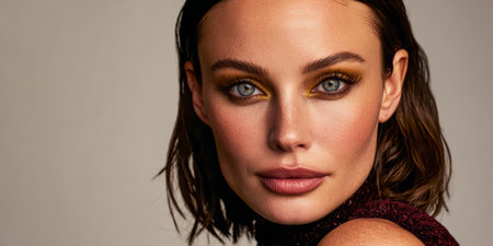 A young woman poses confidently with soft waves in her hair and captivating makeup. The neutral backdrop highlights her radiant complexion and striking features, perfect for a fashion shoot.