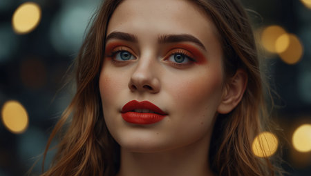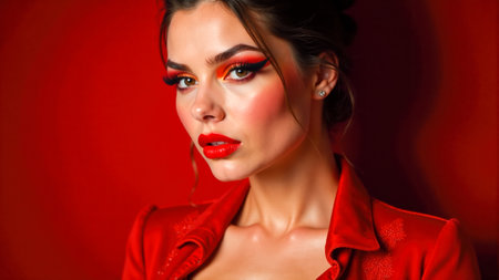 The woman showcases striking makeup with bright red lips and eyes, dressed in a red lace outfit. Her elegant hairstyle frames her face, creating an eye-catching look.