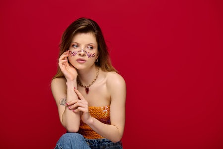 This stunning portrait features a female model showcasing a striking makeup look with vibrant colors and bold accessories set against a red backdrop.