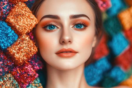 Colorful beauty portrait with bright makeup and artistic background.