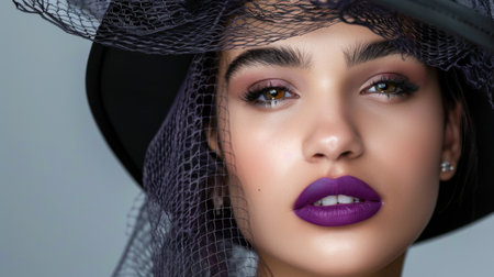 A captivating close-up portrait of a young woman showcasing bold purple lips and elegant makeup, framed by a fashionable hat, exuding confidence and beauty.