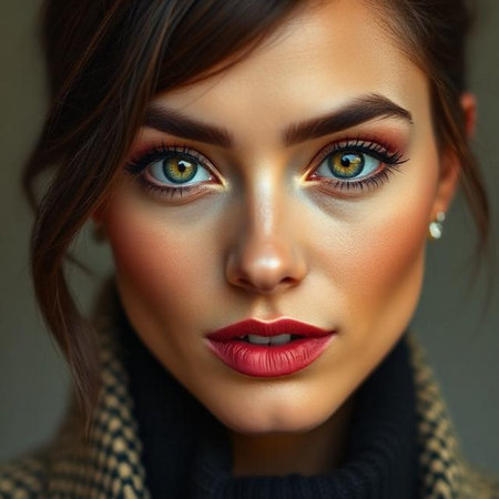 A woman showcases her striking features with elegant makeup and a fashionable outfit. She exudes confidence with a captivating smile while posing against a soft backdrop.