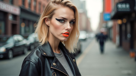 A woman with sharp eyeliner and vivid orange lips stands on a bustling city street. She wears a black leather jacket and exudes confidence amidst urban surroundings.