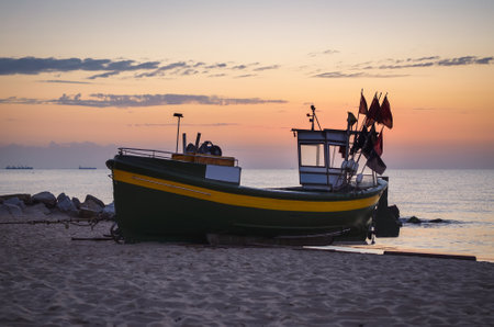 Beautiful morning view at the Polish seaside in Gdynia. Ship on a sandy beach in the morning.