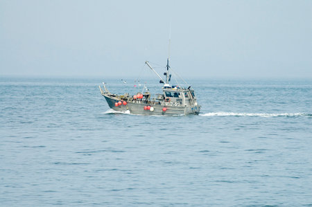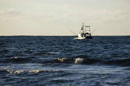 Fishing boat, trawler fishing Razor fish in an open Irish sea. Food industry, traditional craft, environmental damage concepts.