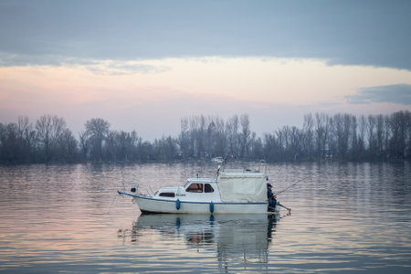 BELGRADE, SERBIA - DECEMBER 25, 2014: Fishermen on a fishing boat fishing on the Danube river during a winter afternoon in Zemun, a northern district of Belgrade.
