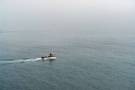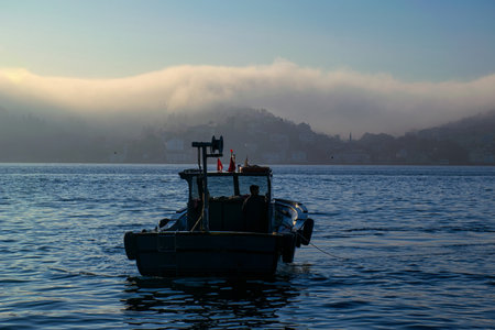 Fishing boat and fisherman in the sea, foggy morning over the water.