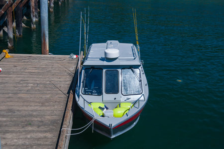 Bodo, Norway - January 04, 2023. A small fisherboat is moored in the atlantic ocean, with the snow-covered mountains of the lofoten in the background.