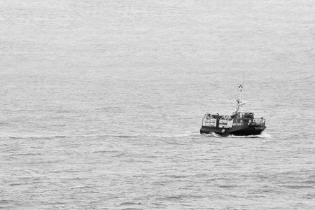 An aerial grayscale shot of a boat sailing in the sea, Karachi coast, Pakistan