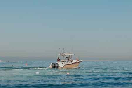 Fishing boat ready to cast the nets on a calm sea day near the coast