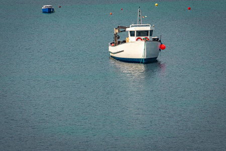 A traditional Cornish fishing boat floating on a beautiful calm ocean with copy space