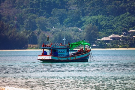 fisherman boat and Vintage wooden boat in sea. Boat drone photo..Aerial view of tropical island beach holiday yacht on blue reef ocean