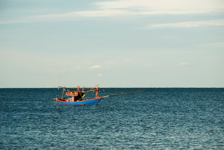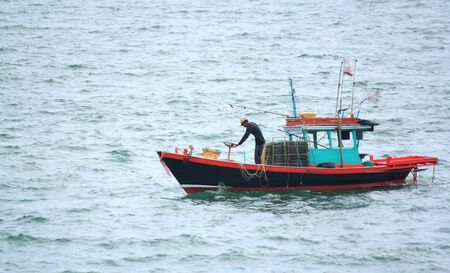 Phetchaburi,Thailand - Mar 15, 2020 : The fisherman and wooden fishing boat used as a vehicle for finding fish in the sea. Selective focus.