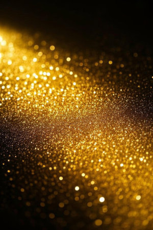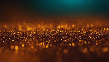 Shimmering showing close up macro shot of golden glitter particles scattered across a surface with a blurred dark...