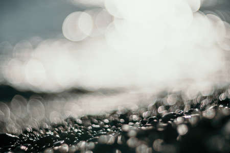 Abstract nature summer ocean sunset sea background. Small waves on water surface in motion blur with bokeh lights from sunrise. Holiday, vacation and recreational background concept.